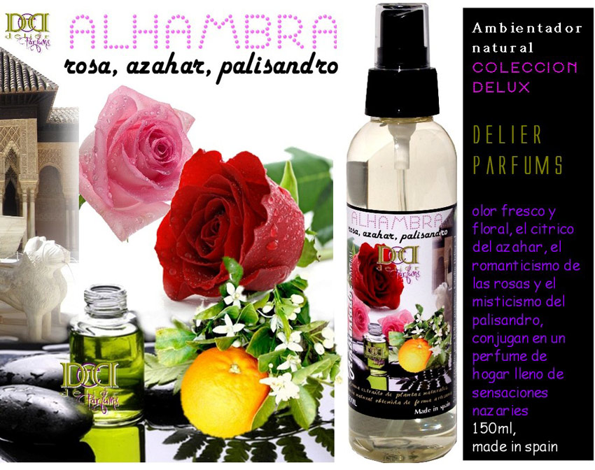Ambientadores de gama alta para el hogar creados por delier parfums en España, Destaca por su agradable fragancia a rosas y la fuerza del palisandro con gotitas de azahar, fórmula AVANZADA Y patentada delier, un ambientador eficaz contra fuertes olores, animales, antitabaco, etc,,, instantáneo, se mantiene en el ambiente todo el día solo con un clic, dejando un olor suave y natural. Olores creados por expertos en aromaterapia, este ambientador por su mezcla de esencias puras de plantas, esta concebido para crear sensaciones relajantes, llenas de vitalidad y energía, si quieres ser distribuidor a nivel personal o profesional solicita información.