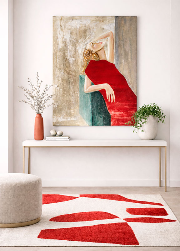 Hay piezas que no solo decoran, sino que transforman la energía de una estancia. Este cuadro, nacido en el corazón de nuestro estudio en Talavera-Toledo, es un homenaje a la sofisticación y la fuerza femenina. La figura, envuelta en un rojo vibrante y profundo, emerge de un fondo texturizado que narra su propia historia. No es solo pintura; es una experiencia táctil y visual creada a mano, original y exclusiva por Delier.