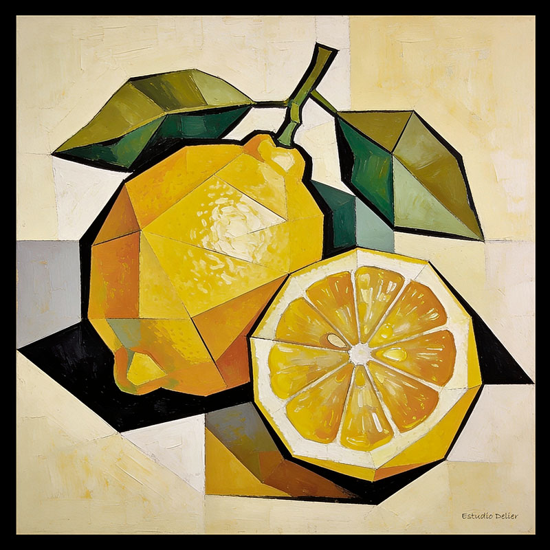 Inyecta una dosis de energía y luz a tus paredes con el cuadro de limón de Estudio Delier. Esta obra, de marcado carácter contemporáneo, utiliza el lenguaje del cubismo para descomponer la forma del cítrico en planos geométricos vibrantes. Los matices amarillos y verdes, combinados con toques de luz blanca, crean una pieza que irradia frescura y vitalidad.