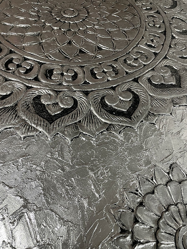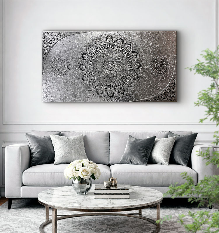 Cuadro representación de un mándala budista, realizado en estuco y plateado artesanalmente en pan de plata efecto viejo, realizado por delier de forma artesanal, bastidor de madera de 3.5cm, trasera en madera, y lienzo, el fondo y relieves del rosetón son texturizados en estuco, decorado en pan de plata, fondo en pan de plata con relieve y rosetones en plata vieja con pátina en negro. Un cuadro decorativo exclusivo y con símbolos energéticos positivos, decoración impactante en el salón, dormitorio, pasillos, decora con obra original, los cuadros son las piezas más importantes de la DECORACIÓN .Los mándalas son diagramas o representaciones esquemáticas y simbólicas del macrocosmos y el microcosmos, utilizados en el budismo y el hinduismo. Estructuralmente, el espacio sagrado (el centro del universo y soporte de concentración) ampliar info. Cada cuadro es único y no se parece al otro, todos se hacen uno a uno, el de la foto es el prototipo como referencia, los tonos plateados según la luz cambian de color, si dudas consultanos.