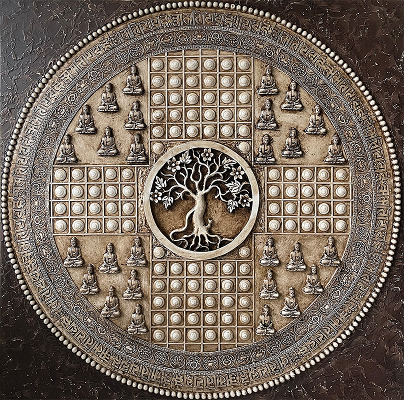 Mandala original cuadro realizado totalmente a mano, de forma artesana, sobre bastidor y trasera de madera, lienzo, texturas y relieves en fibra y estuco, colores predominantes los tierras y tostados con efecto viejo, mide 100x100cm ideal para decoraciones donde el estilo fusion con un toque oriental crea espacios mágicos y protectores, este cuadro Mandala representa la planta del templo visto desde arriba, coronado por esferas y protegido con figuras de buda iluminado, en el centro un relieve con el árbol de la vida, símbolo de eternidad y prosperidad, tiene una corona con un mantra tibetano, se piensa que la contemplación de un Mandala posibilita el despertar espiritual y el crecimiento psicológico y emocional, a la par que acelera el proceso de iluminación, todos los cuadros se hacen uno a uno, todos salen en matices o tonos distintos, pero justo esto es lo bueno, que es único y original, podemos cambiar el color si nos lo pides.