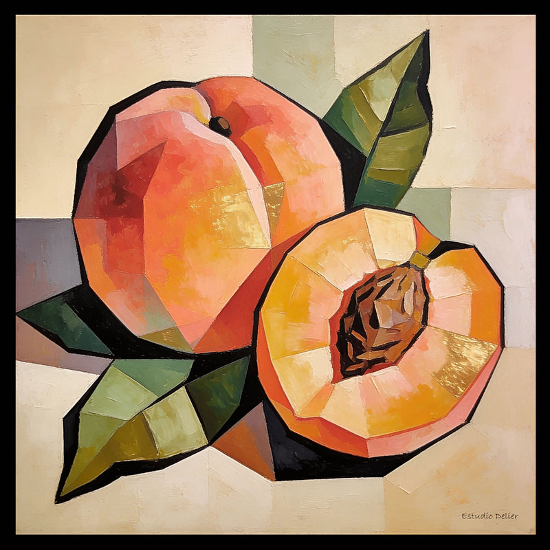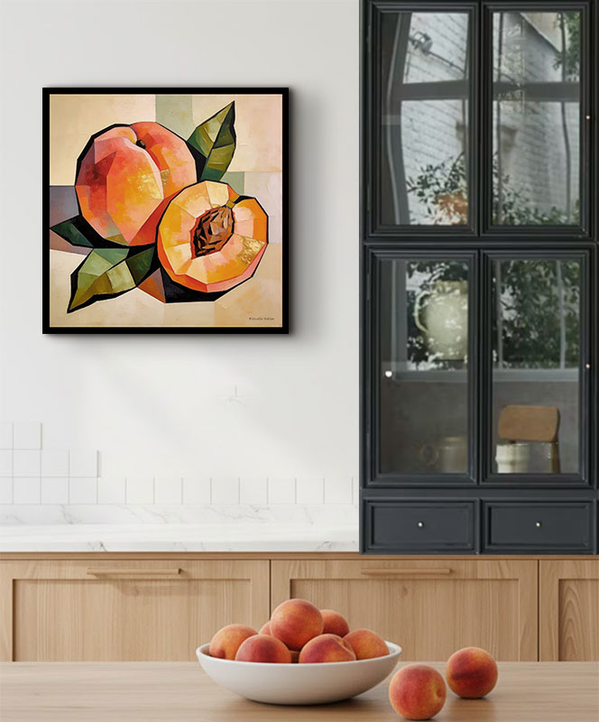 Cuadros de cocinas, cuadros modernos de frutas, arte cubista melocotón, decoración comedor elegante, bodegones modernos, cuadros Estudio Delier, arte para paredes de cocina, cuadros 50x50 decorativos.