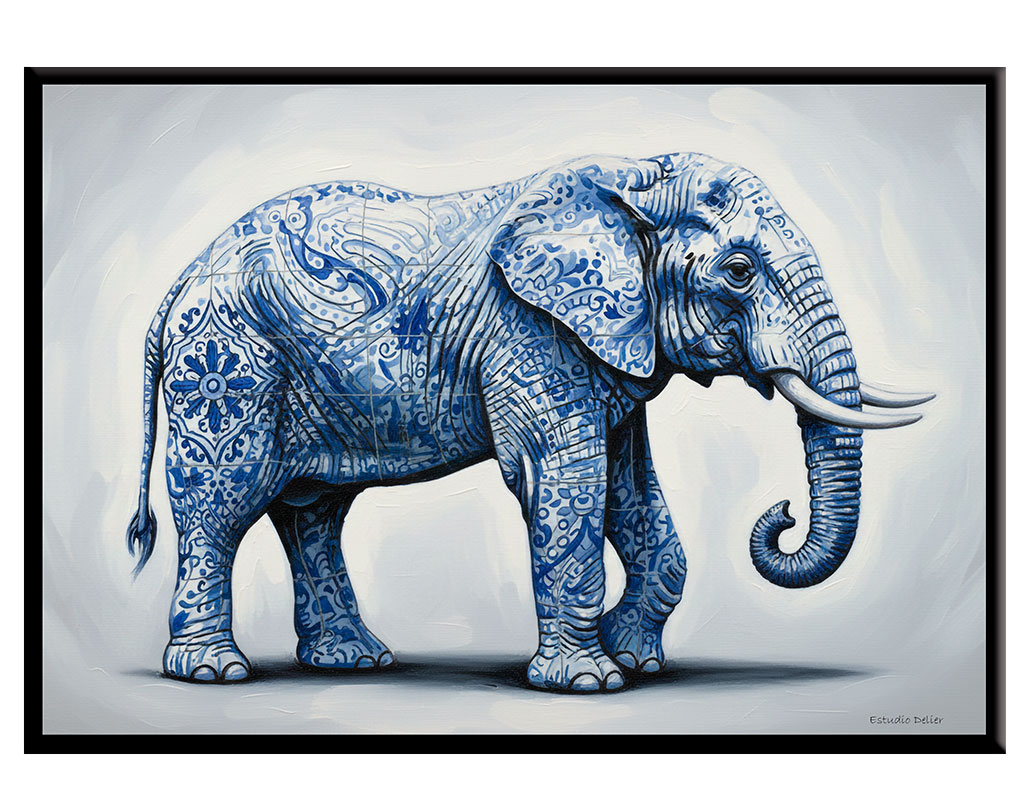 Descubre la armonía perfecta entre la vanguardia y la artesanía con el cuadro de elefante azul de Estudio Delier. Esta obra es una pieza de arte moderno excepcional, donde la silueta imponente del elefante se viste con los intrincados y bellos patrones de la cerámica tradicional de Talavera.