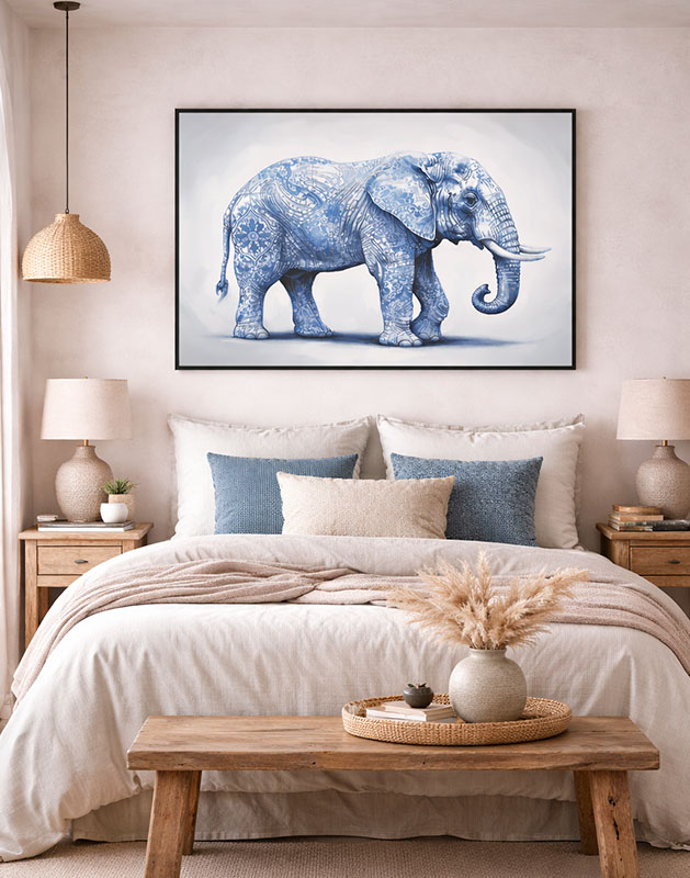 Simbología: El elefante, símbolo de fortuna y sabiduría, representado con una estética refinada de autor.