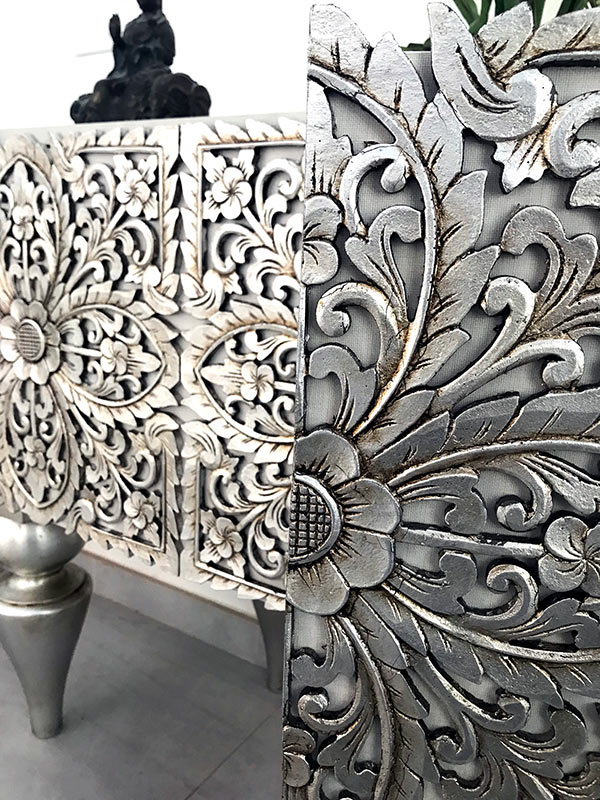 Mueble original, diseño exclusivo delier, realizado íntegramente en España, sorprenden los relieves frontales de las dos puertas, decorados en pan de plata efecto viejo en tono champán, las patas torneadas en madera maciza de pinto, también acabadas en pan de plata champán, cuenta con dos patas completas frontales y dos medias patas traseras, el armazón es en madera mdf de alta calidad con una suave textura efecto lino, color arena claro, el interior del mueble es diáfano tipo contenedor, perfecto para la entrada, como zapatero, para el salón, como aparador, para el dormitorio para guardar ropa....., mueble artesano. depende de la fabricación puede cambiar algún matiz por temas de resistencia o estética, se entrega con agencia asegurado a todo riesgo en puerta de casa o portal de edificio y con las patas desmontadas por temas de transporte, solo hay que atornillarlas, importante, no abrir las dos puertas a la vez, sin que este colocado ni vacío, si te gusta el espejo está disponible en la web espejos