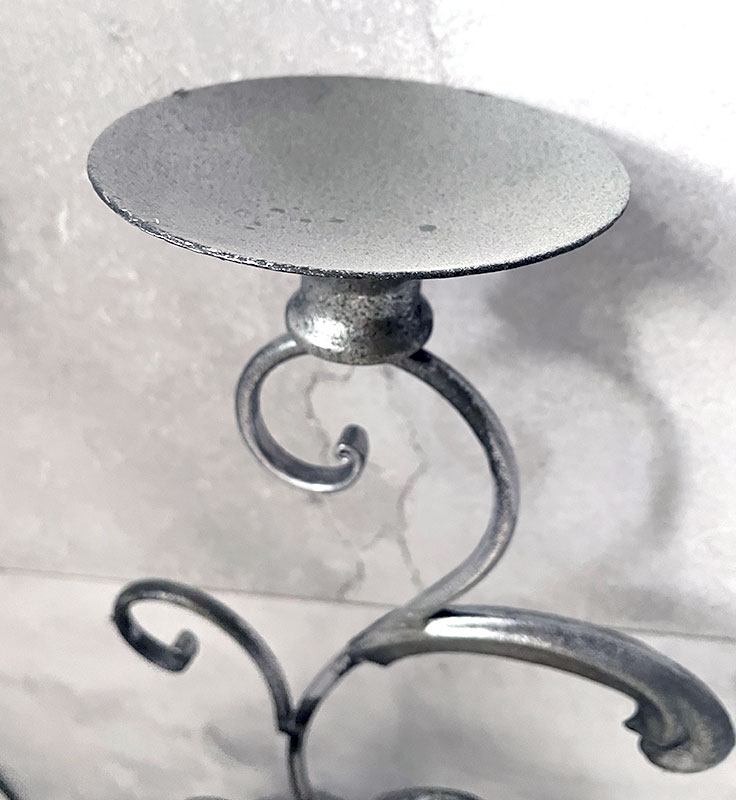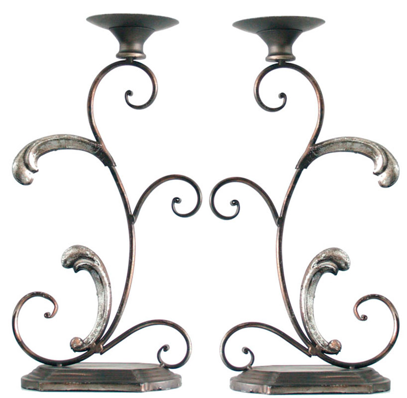 Aporta elegancia y carácter a tu hogar con este juego de dos candelabros de metal envejecido, diseñados con delicadas formas curvas de estilo clásico. Su acabado en tono metal viejo con sutiles pinceladas de plata crea un efecto sofisticado y atemporal, ideal para ambientes tanto rústicos como modernos.